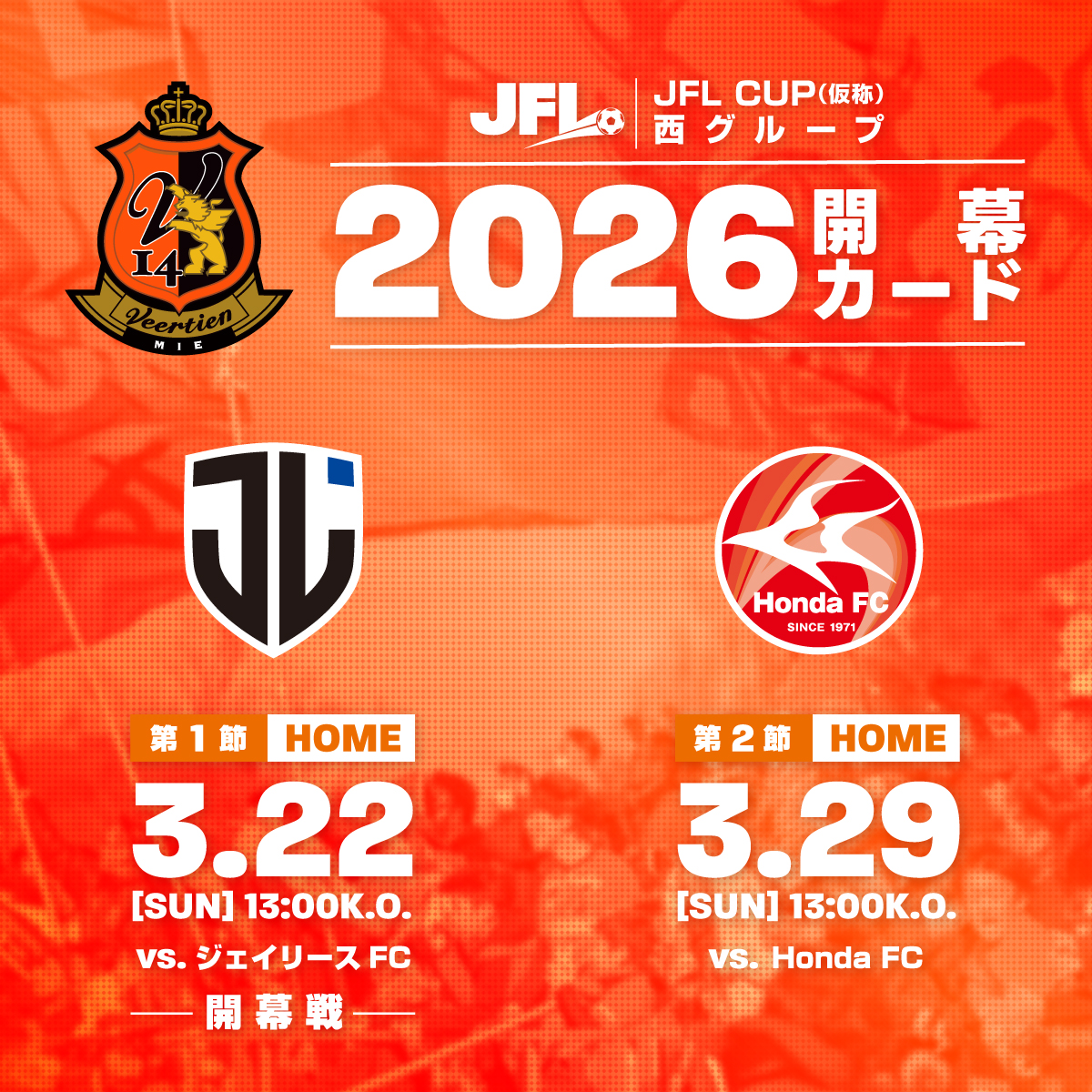 HOME GAME SCHEDULE HOME JFL CUP 第1節|13:00 KICK OFF 3.22 sun vs ジェイリースFC @ --- HOME JFL CUP 第2節|13:00 KICK OFF 3.29 sun vs Honda FC @ --- more >