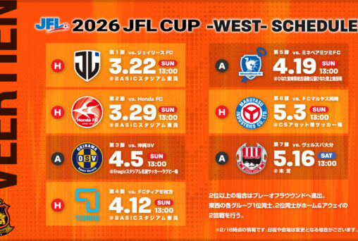 HOME GAME SCHEDULE HOME 2026 JFL CUP 第1節|13:00 KICK OFF 3.22 sun vs ジェイリースFC @BASICスタジアム東員 --- HOME 2026 JFL CUP 第2節|13:00 KICK OFF 3.29 sun vs Honda FC @BASICスタジアム東員 --- HOME 2026 JFL CUP 第4節|13:00 KICK OFF 4.12 sun vs FCティアモ枚方 @BASICスタジアム東員 --- more >