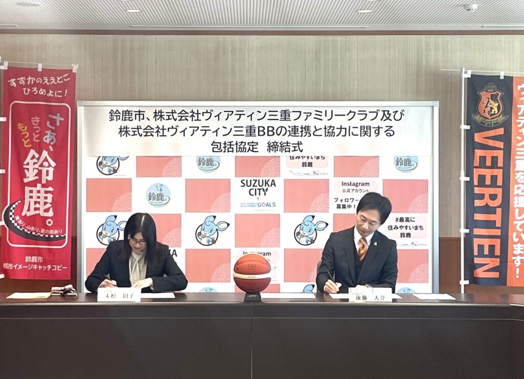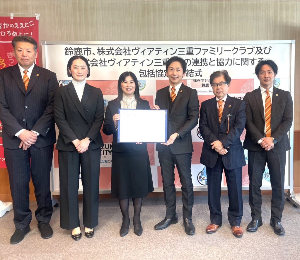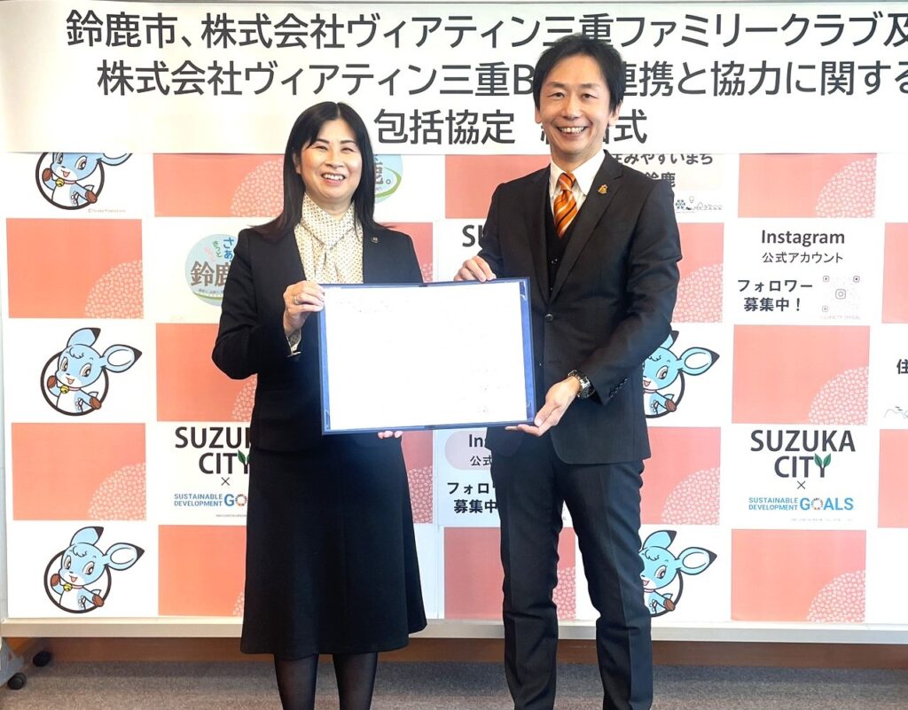 「鈴鹿市、株式会社ヴィアティン三重ファミリークラブ及び株式会社ヴィアティン三重BBの連携と協力に関する包括協定締結式公開調印式」において「包括的連携協定」を締結いたしました。