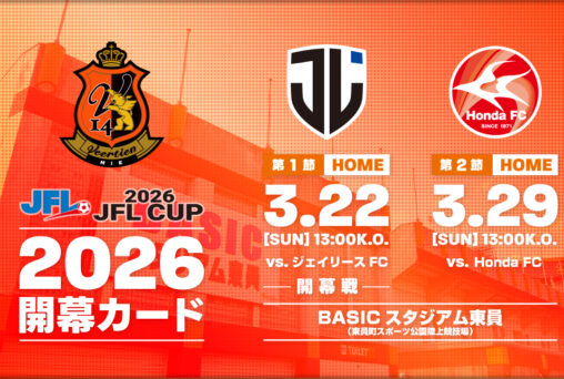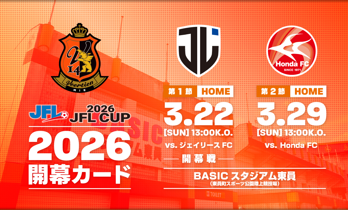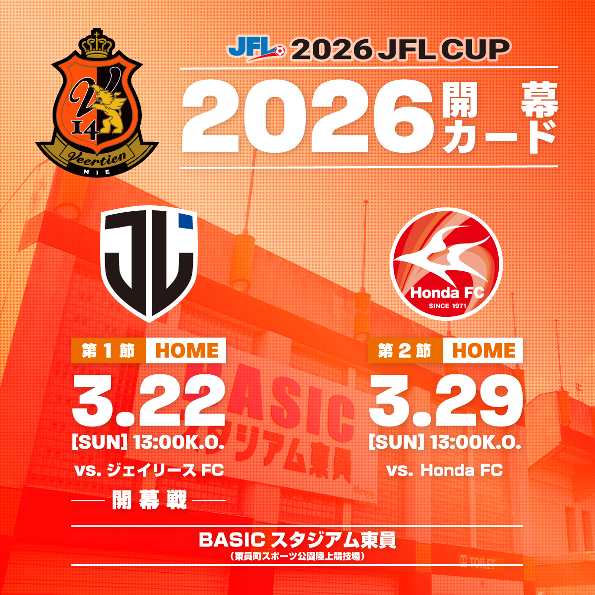 HOME GAME SCHEDULE HOME JFL CUP 第1節|13:00 KICK OFF 3.22 sun vs ジェイリースFC @BASICスタジアム東員 --- HOME JFL CUP 第2節|13:00 KICK OFF 3.29 sun vs Honda FC @BASICスタジアム東員 --- more >