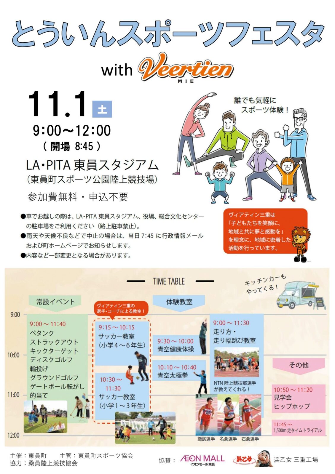 11月1日(土)、LA・PITA東員スタジアム(東員町スポーツ公園陸上競技場)にて「とういんスポーツフェスタ with ヴィアティン三重」が開催されます。