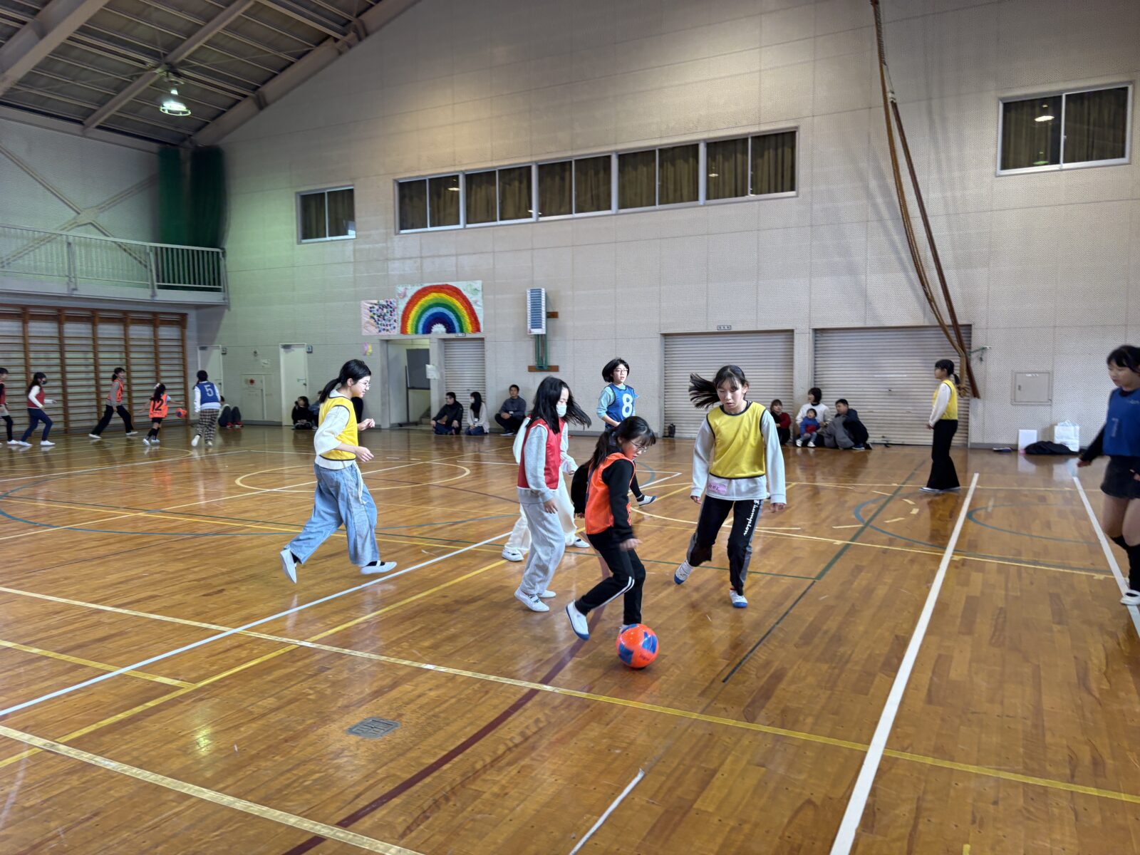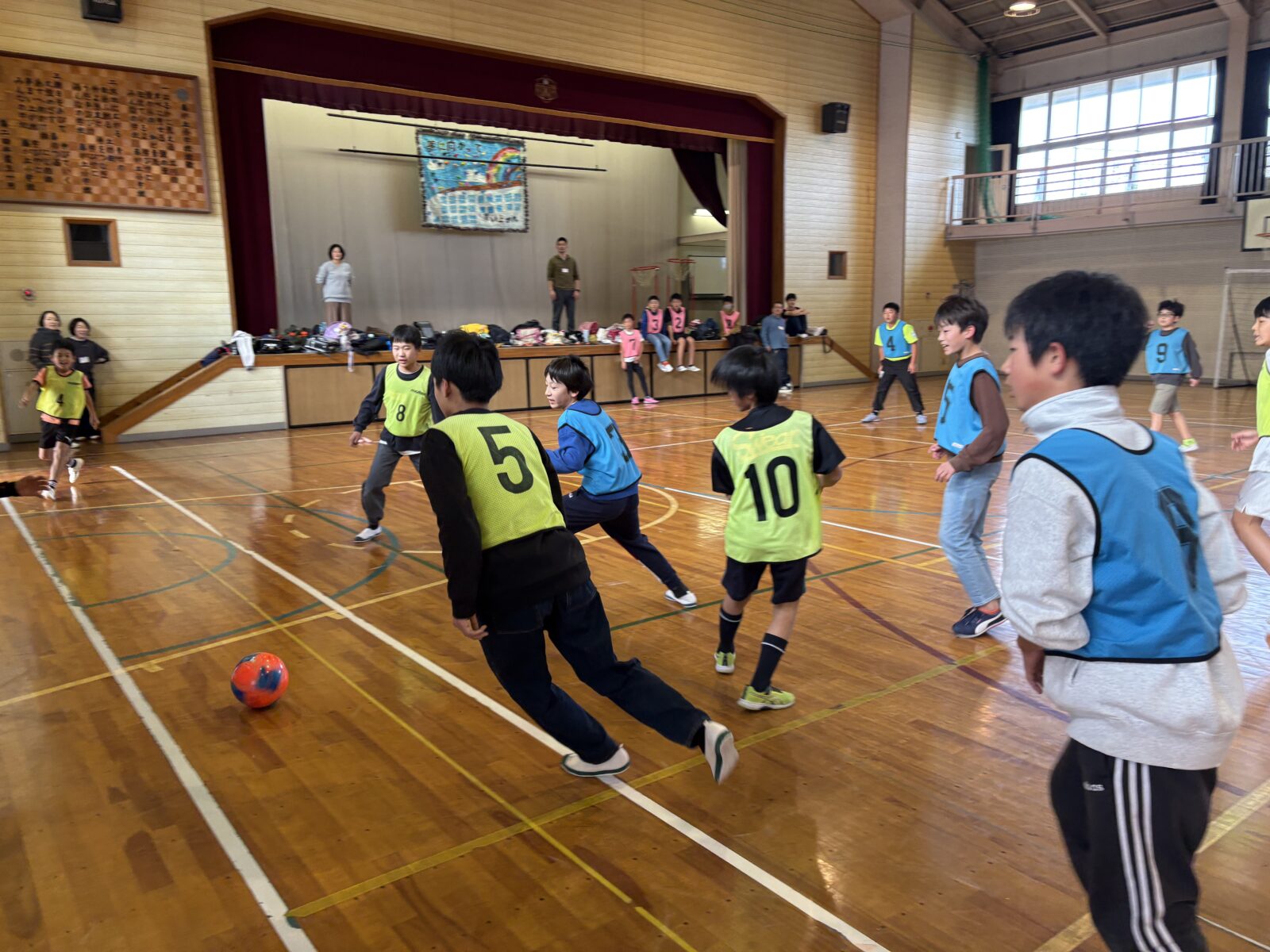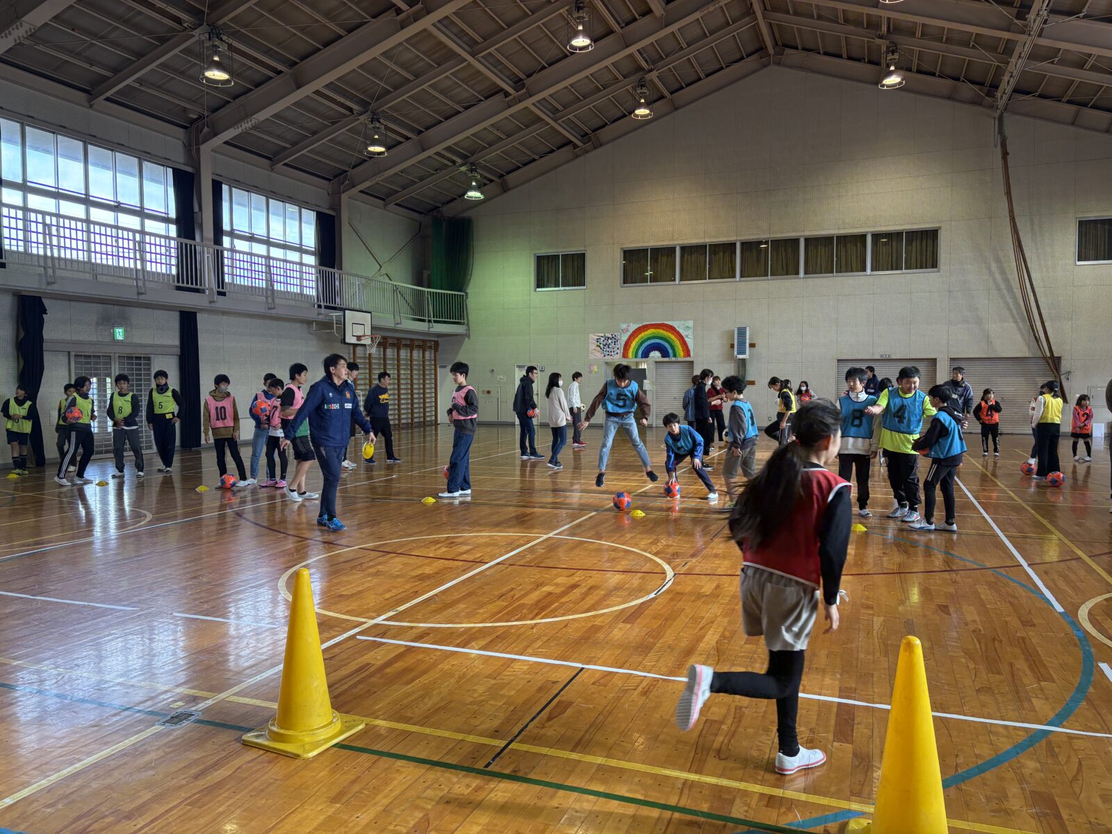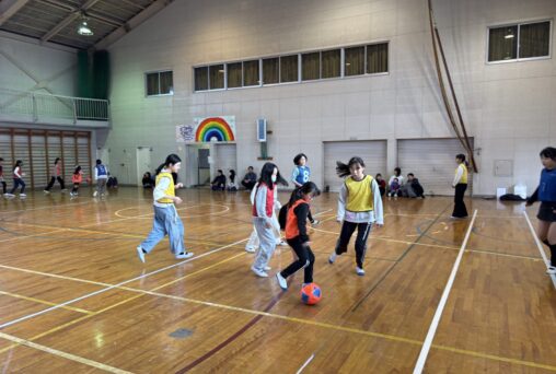 ウォーミングアップで体を動かしたあと、チームに分かれてボールに触る練習を行い、最後はみんなで試合をして盛り上がりました。