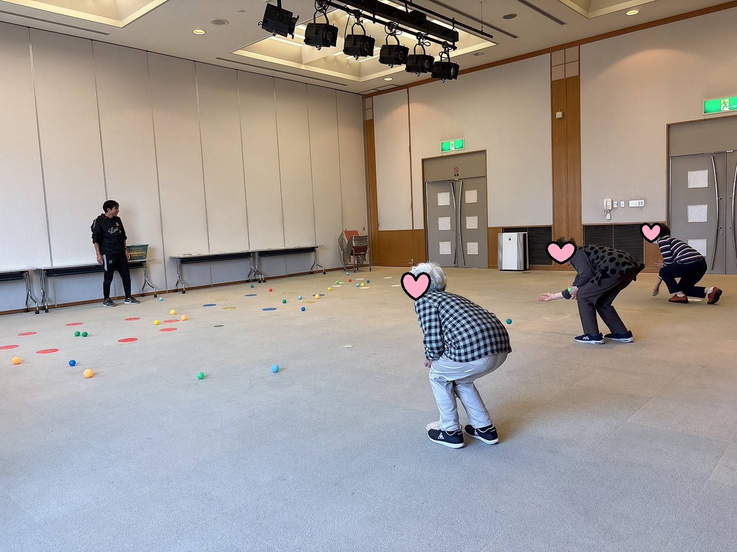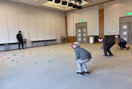 レクリエーションパートでは、気分を変えてミニボールで遊んでみました。お手玉のようにいくつものボールを投げてキャッチしたり、二人で投げ合ったり、転がして的に入れたり… 単純でしたが競争もあり、今回もたくさんの笑顔と共に身体を動かすことができました!