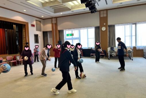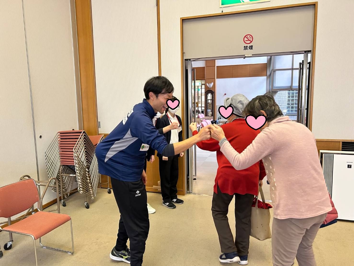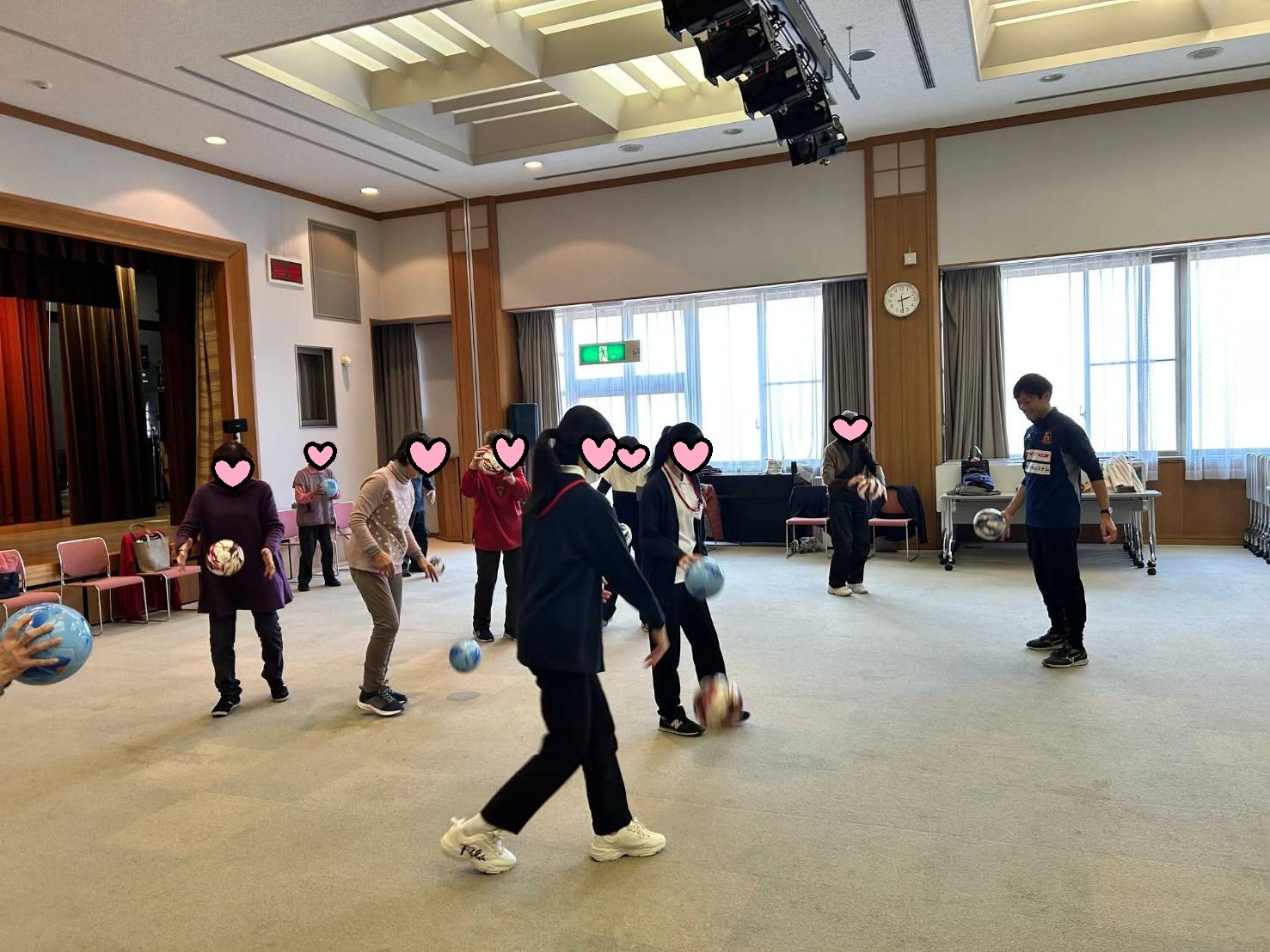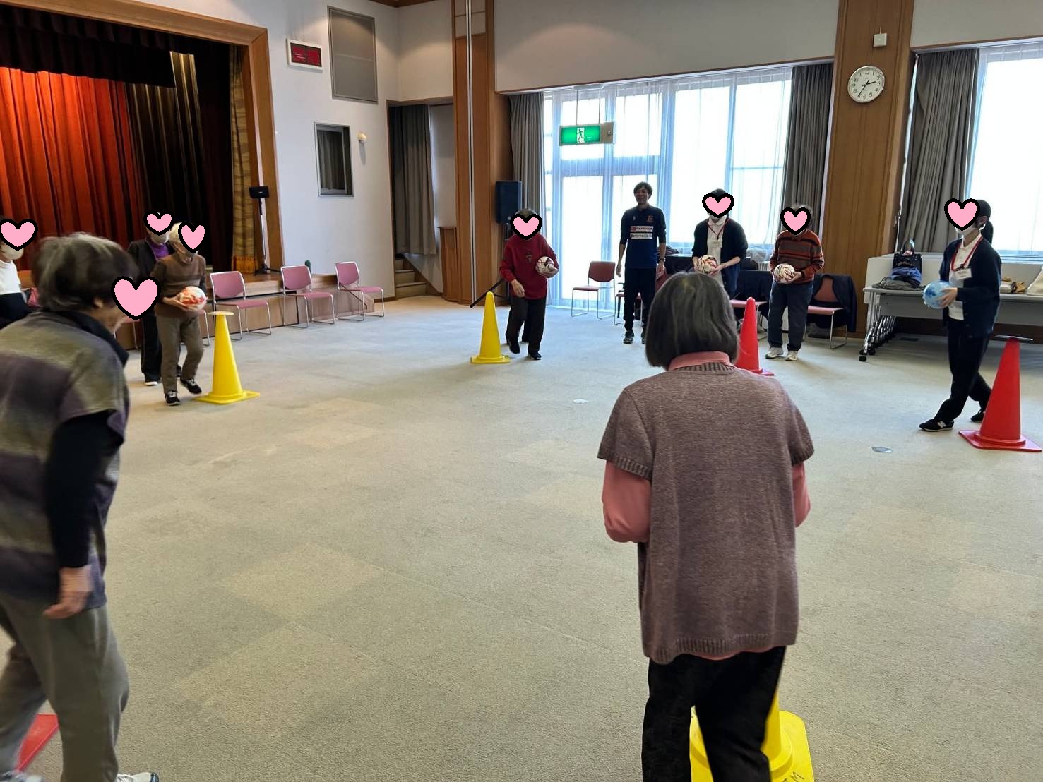 ボールを使ったストレッチや筋力アップ、2人組でパス交換をしてみたり、ボールをついたり投げたりしながら動くなど、単純な身体機能の維持改善から認知機能・判断能力の改善など、様々な要素に刺激を入れてもらいました。何よりボールを使うと皆さん童心に帰り、誰でもスッと「楽しむ」「チャレンジする」モードに入ることができますね。学生さんたちも熱心にチャレンジしてくれて、その声に感化されてか参加者の皆様もいつも以上に声が上がっていましたよ!