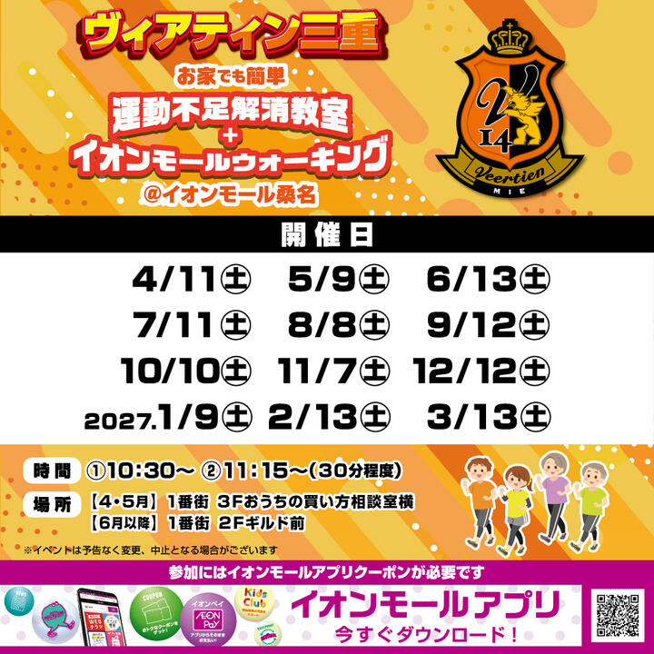 この度、イオンモール桑名 1番街にて、2027年3月までの毎月一回「運動不足解消教室+イオンモールウォーキング」を開催します。