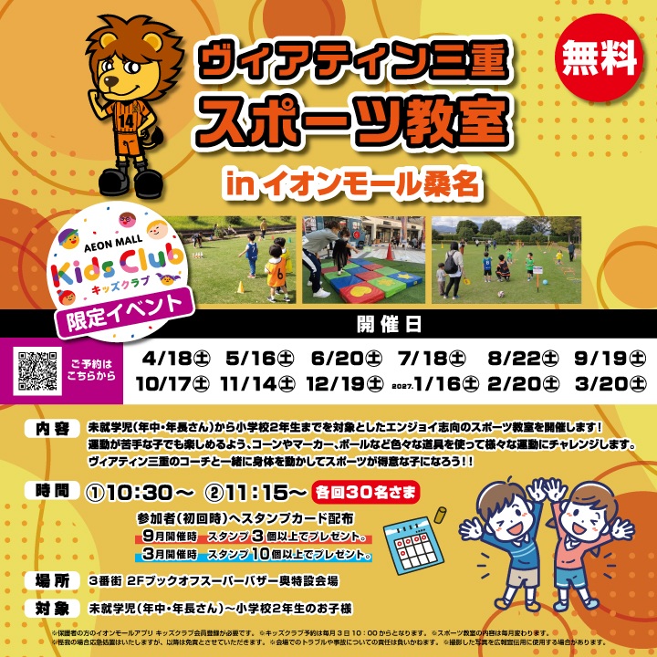 イオンモール桑名にて、未就学児~小学校低学年を対象としたスポーツ教室を行います。