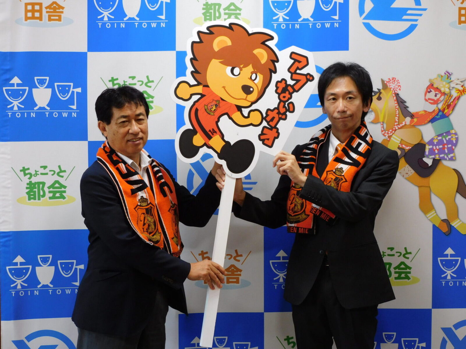6月29日に執り行われた贈呈式では、水谷 俊郎東員町長宛に弊クラブの後藤 大介代表取締役社長より「とびだしヴィアくん」をお渡しし、水谷町長からは温かい激励のメッセージも頂戴いたしました。