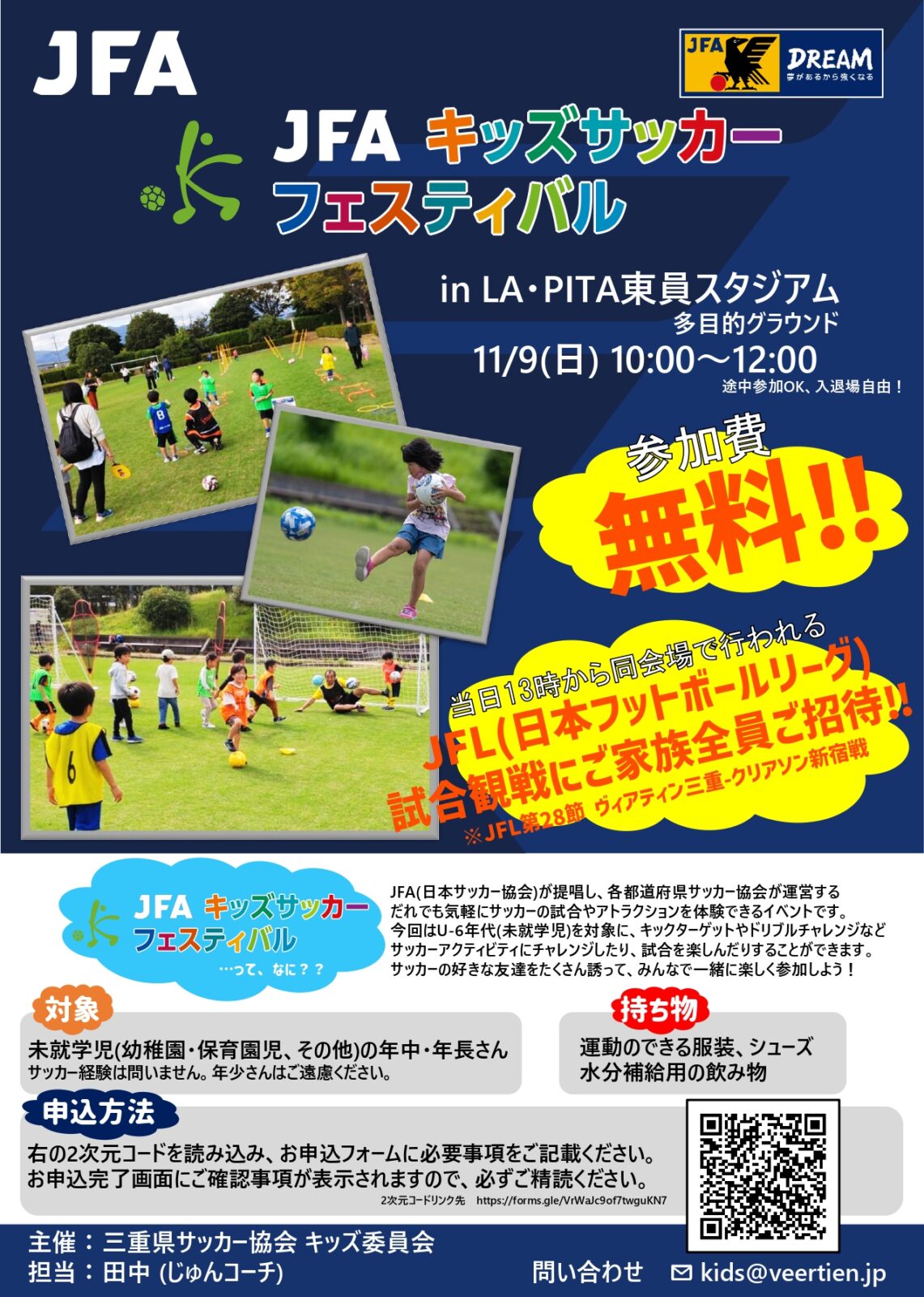 11/9ホームゲーム同日、スタジアム横の多目的グラウンドで「JFAキッズサッカーフェスティバル(主催:三重県サッカー協会キッズ委員会)」が開催されます。だれでも気軽にサッカーの試合やアトラクションを体験できるイベントです!詳細・申込はこちらから↓