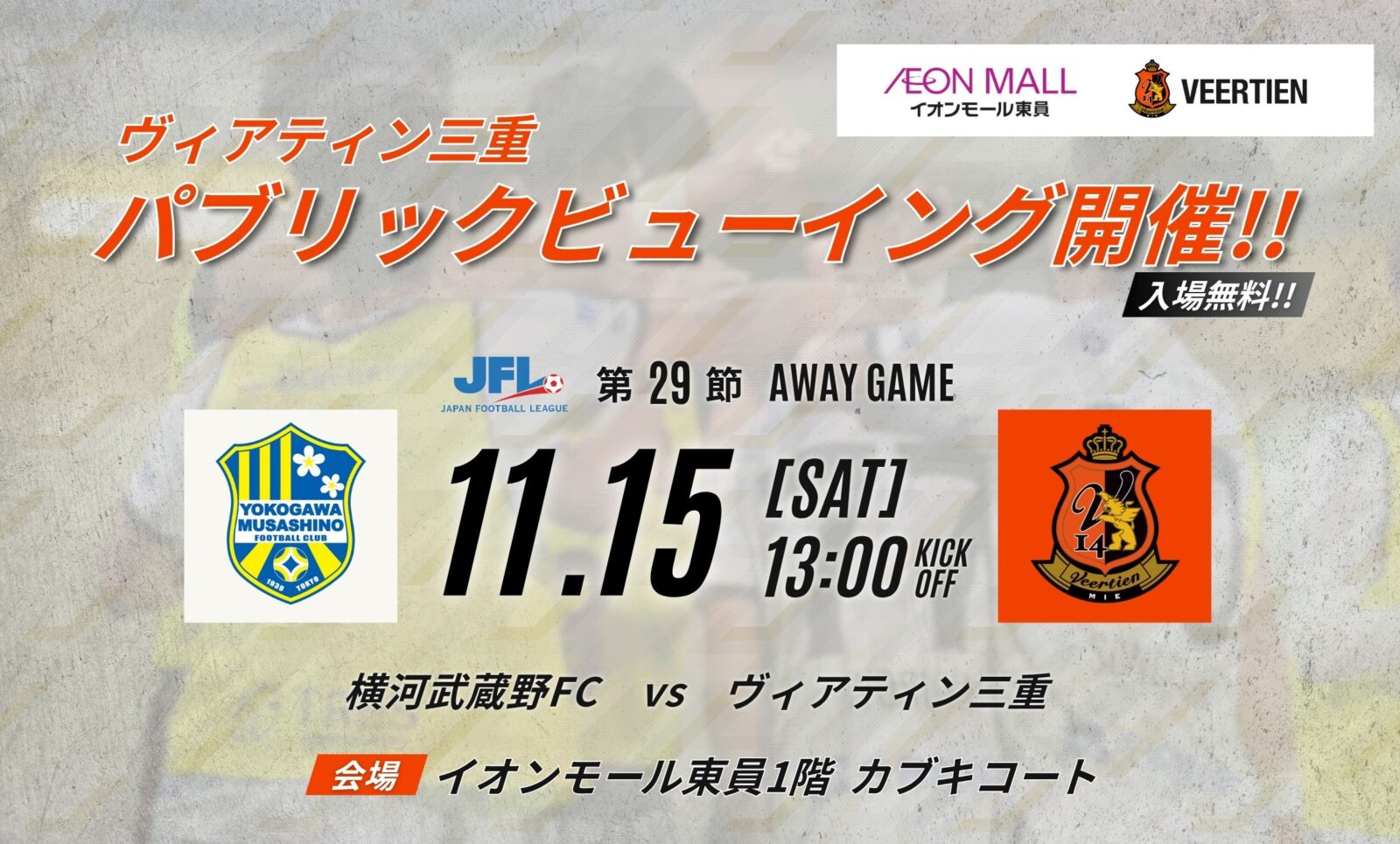 11月15日(土)、イオンモール東員にてアウェイゲーム(横河武蔵野FC戦)のパブリックビューイングを開催しますので、お知らせいたします。今季最後のアウェイゲーム、三重から選手たちへ熱い想いを届けましょう!