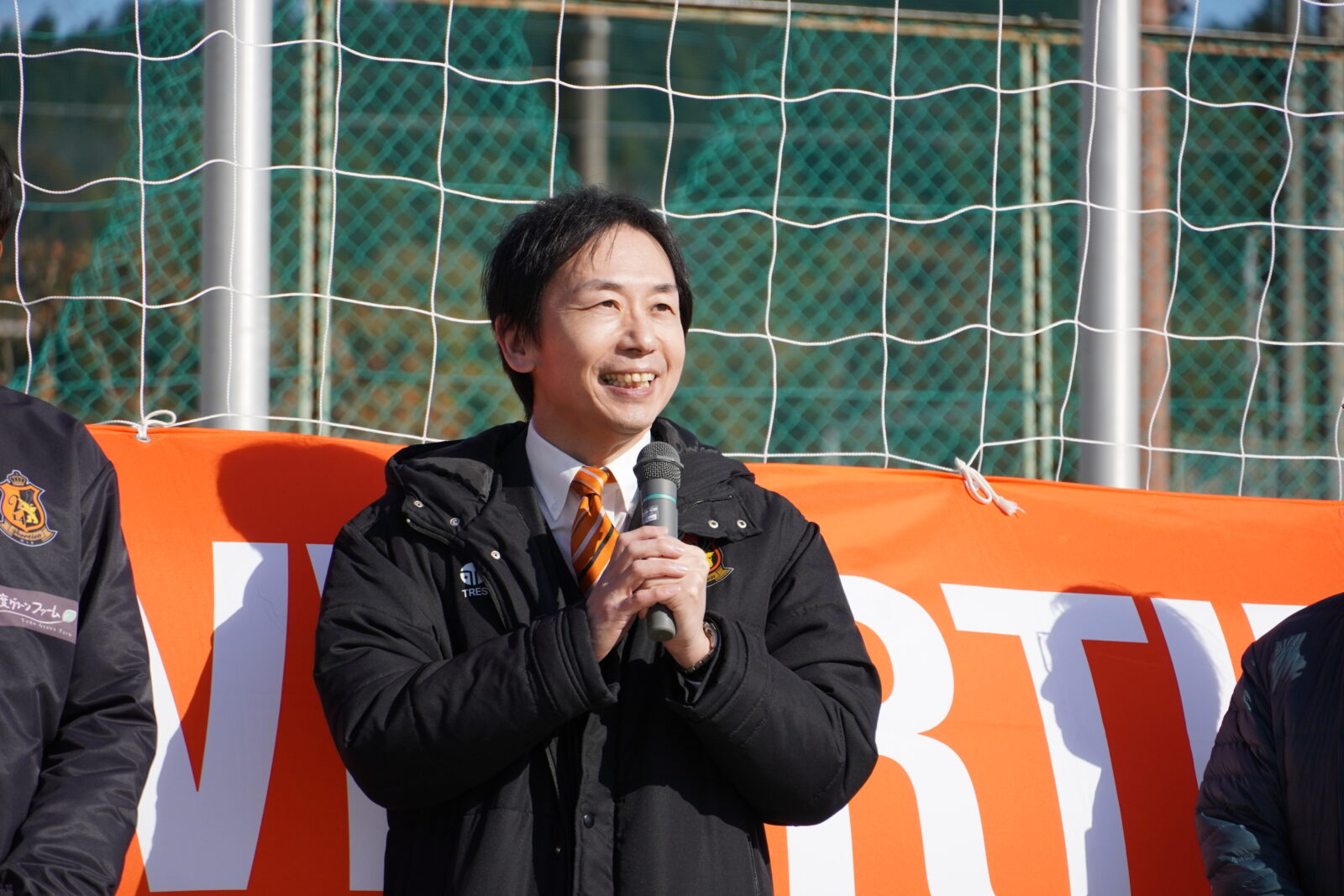 「立派なゴールを寄贈いただき、ありがとうございます。後藤社長からもありましたが、小さな子どもから成人までこのグラウンドで様々なスポーツを行っております。ヴィアティン三重さんご指導のサッカー・スポーツ教室も行っていただいており、当町のチームも良い成績を残していると聞いており、ヴィアティン三重さんのおかげだと感謝しております。これからも感謝の気持ちをもって、このグラウンド・ゴールを使わせていただきます。本当にありがとうございました。」