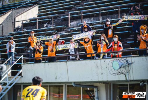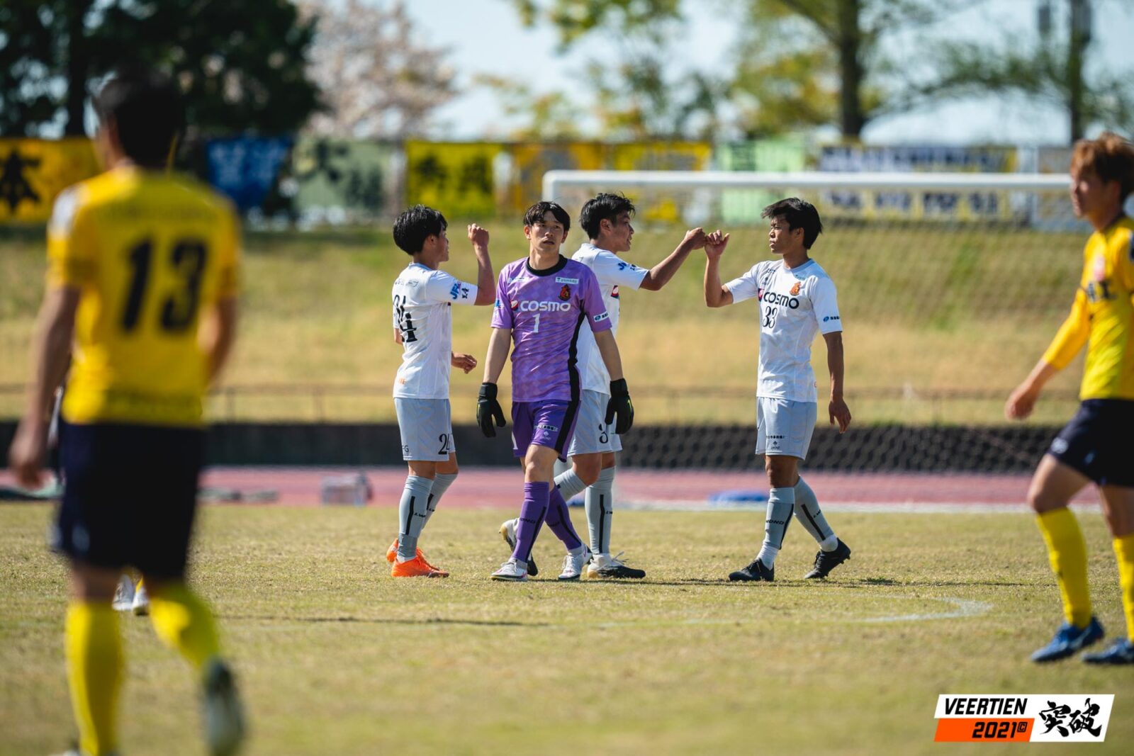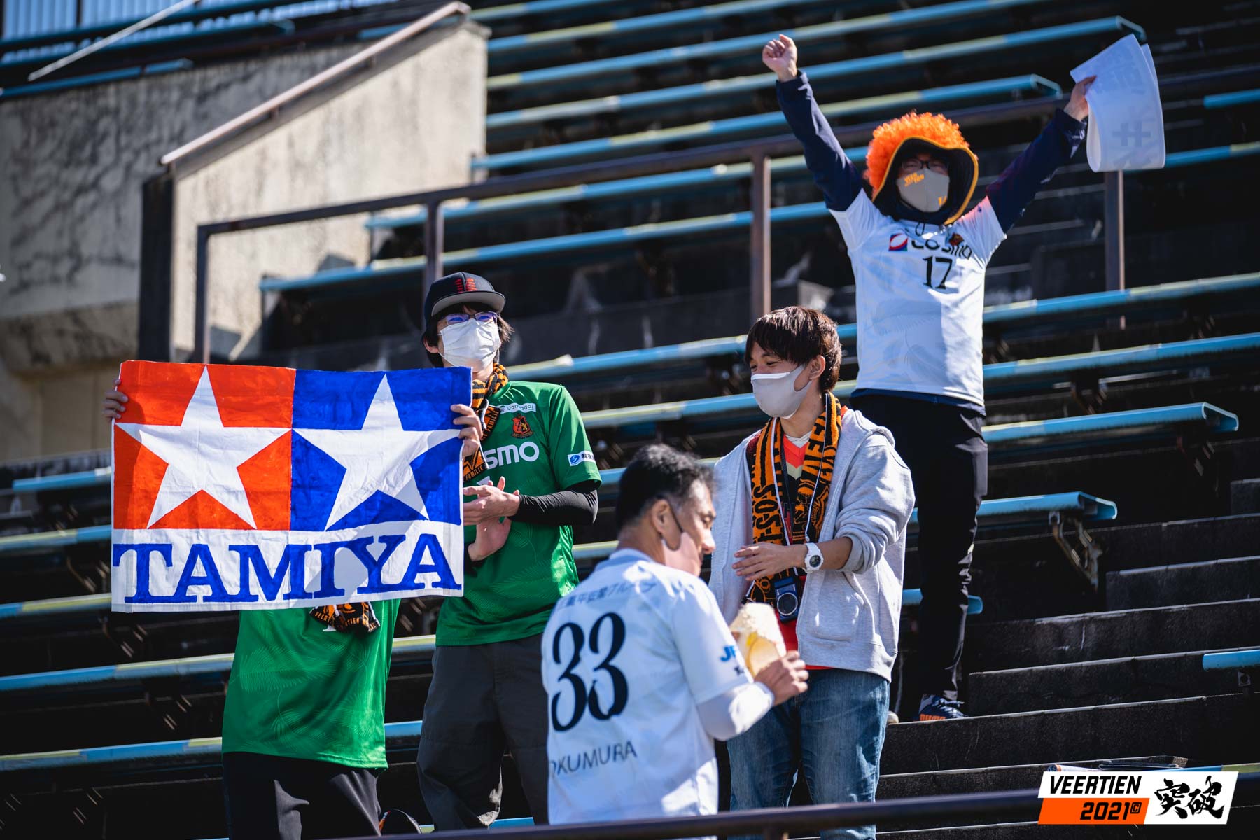 追加点は奪えなかったものの最後まで守りきって試合終了のホイッスル。アウェー松江の地で今季2勝目を飾った。勝ち切った瞬間、声を上げて喜び、⑨酒井と⑦塩谷が抱き合う。なんとも清々しいシーンだった。