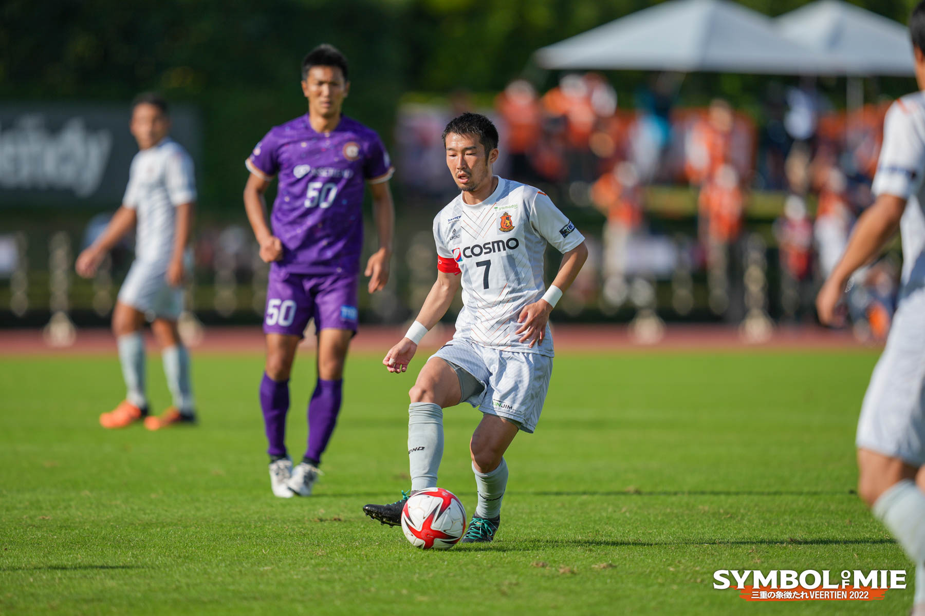 10月後半にも関わらず気温は25℃を超え、体感では夏をを感じさせるような汗ばむ気候。二連勝と好調なだけに三重から駆けつけたサポーターも多い。そして東京開催とあって関東エリアに縁のある選手らの家族や友人がスタジアムには多く駆けつけオレンジ色のシェアは紫に負けていない。新宿ボールでキックオフ。開始早々に相手ボールを拾ったところからゴールに迫り、開始30秒で㉔池田のシュート、勢いを持って試合に入る。立ち上がり5分で3回ほど相手ペナルティエリアに入り込み得点の期待が高まる。