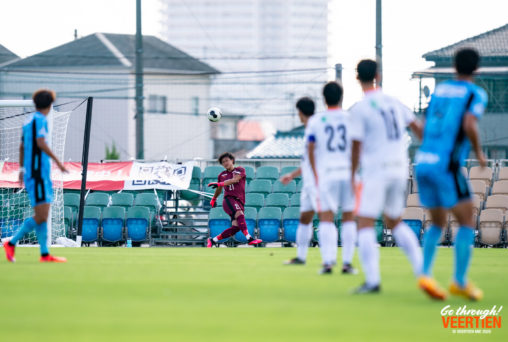22分・右サイドバックの③太田がボールを預けて中央からゴール前に上がり、右サイドに開いた㉚平信からのクロスを受けてシュートを放つがクロスバーを叩く。跳ね返りを相手DFがクリアミス、見逃さなかった⑨古川大悟が技ありボレー!DF二人の外を巻くように弧を描いてゴールに突き刺した。