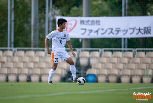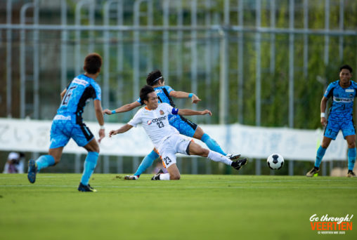 右サイドに入った㉚平信&③太田賢吾、左サイドの⑦塩谷&㉜井上丈が両サイドから展開し中央にボールを集める。中では⑯佐藤洸一と⑨古川大悟が頭で競って相手ゴールを脅かす。FC大阪はセットプレーやロングスローを警戒し、そのたびにゴール前に人数をかけて密集、フィジカルを活かして跳ね返す。