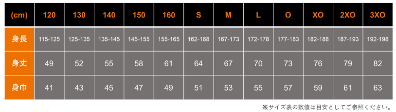 ■サイズ 120~160(5サイズ)、S~3XO(7サイズ)
