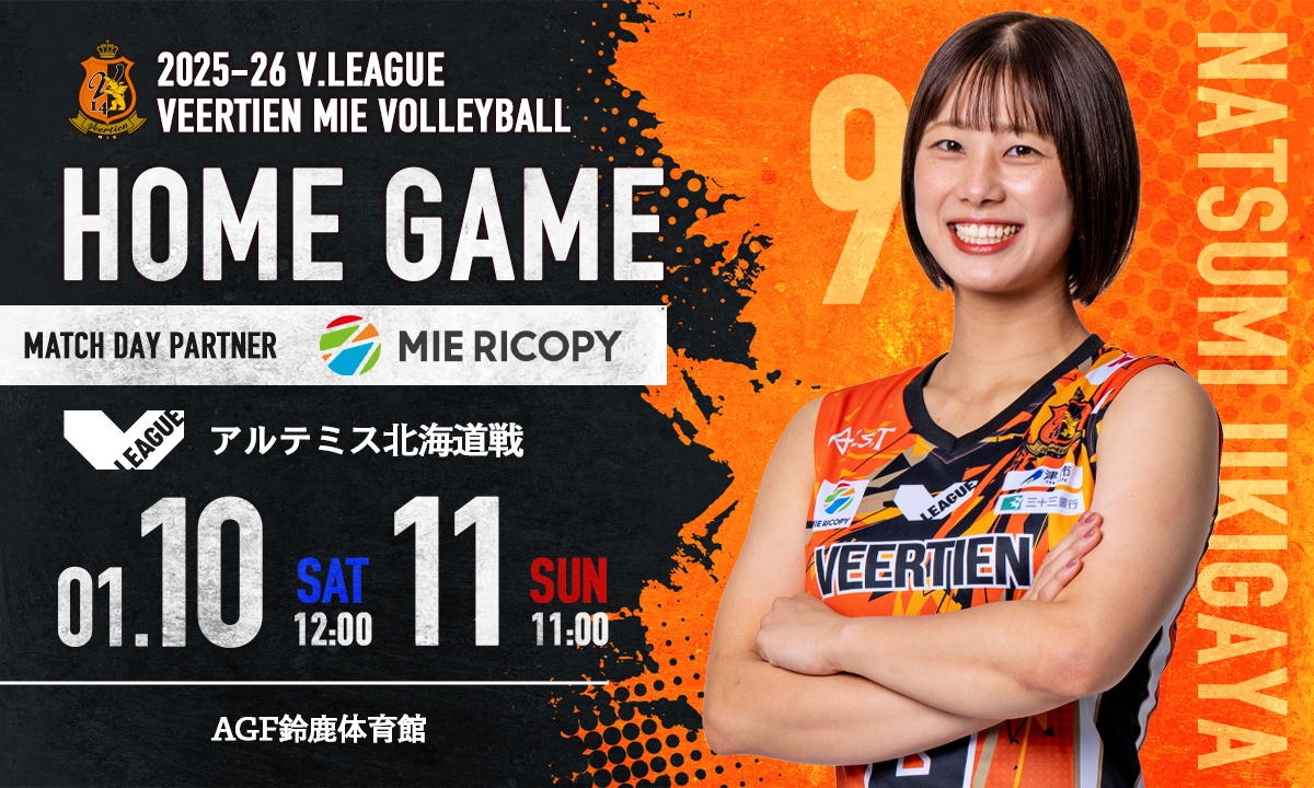 GAME DATE VIEW MORE >> 2025/12/27(土)12:00 vsリガーレ仙台 2024-25 V.LEAGUE WOMEN @安濃体育館 2025/12/28(日)11:00 vsリガーレ仙台 2024-25 V.LEAGUE WOMEN @安濃体育館 2026/01/10(土)12:00 vsアルテミス北海道 2024-25 V.LEAGUE WOMEN @AGF鈴鹿体育館 2026/01/11(日)11:00 vsアルテミス北海道 2024-25 V.LEAGUE WOMEN @AGF鈴鹿体育館