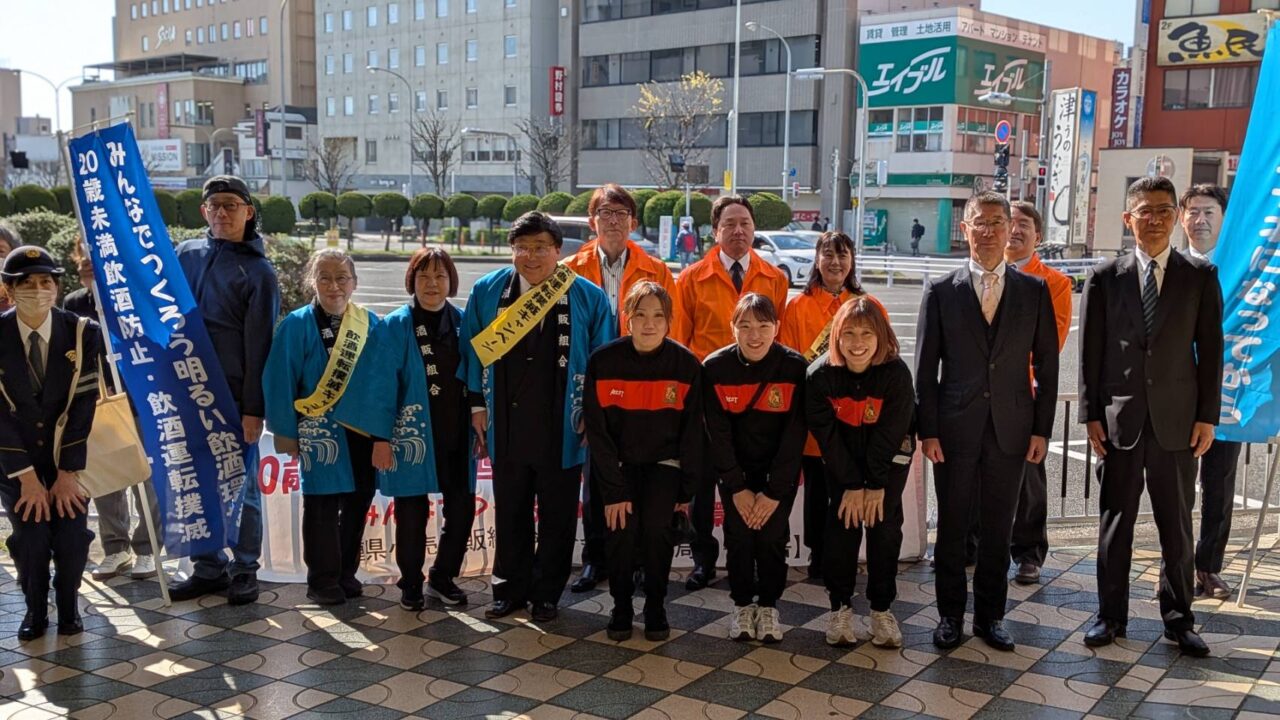 「お酒は20歳から。飲酒運転は犯罪です」をキャッチフレーズに、津駅前で呼びかけをさせて頂きました。