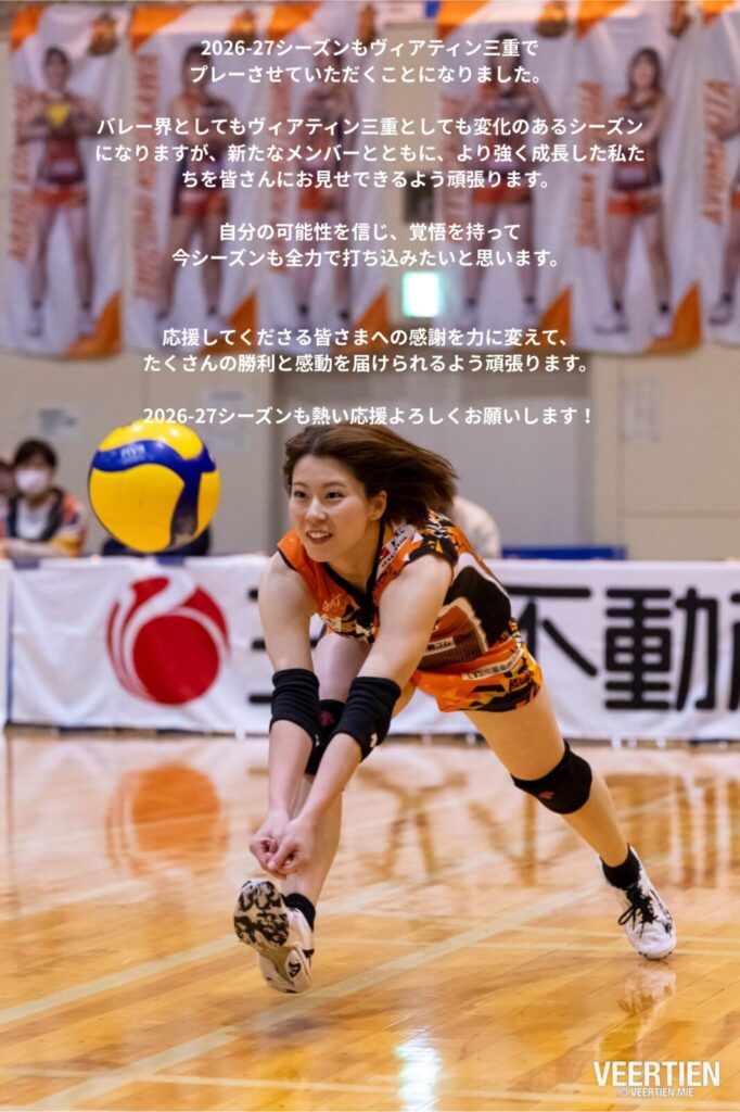 バレー界としてもヴィアティン三重としても変化のあるシーズンになりますが、新たなメンバーとともに、より強く成長した私たちを皆さんにお見せできるよう頑張ります。